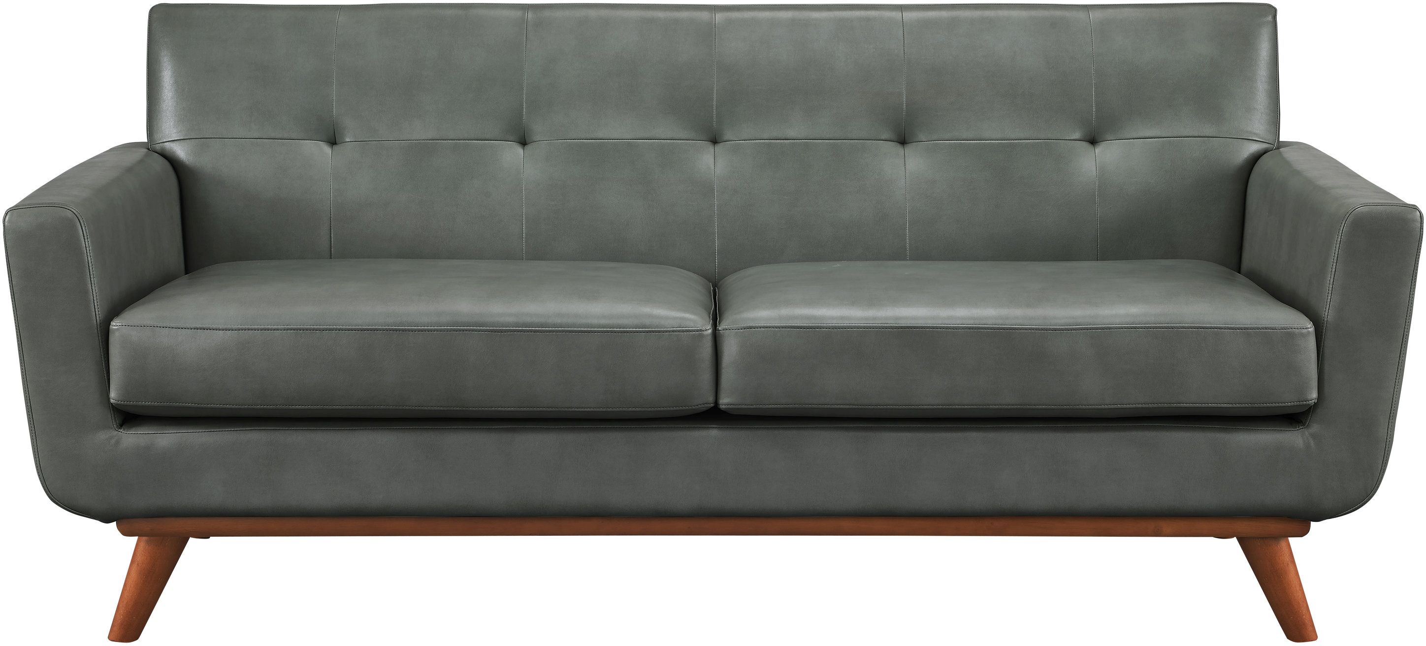 The Lyon loveseat captures the essence of Mid-Century style that refuses to fade into obscurity. The gorgeous smoke grey Vegan Leather is welcoming and adds charm to any room. The cushioned arms provide added comfort, while the small scale tufting adds a pop of personality. Handcrafted the Lyon collection will undoubtedly add style to your space, while the kiln-dried solid wood frame will assure years of support and comfort.