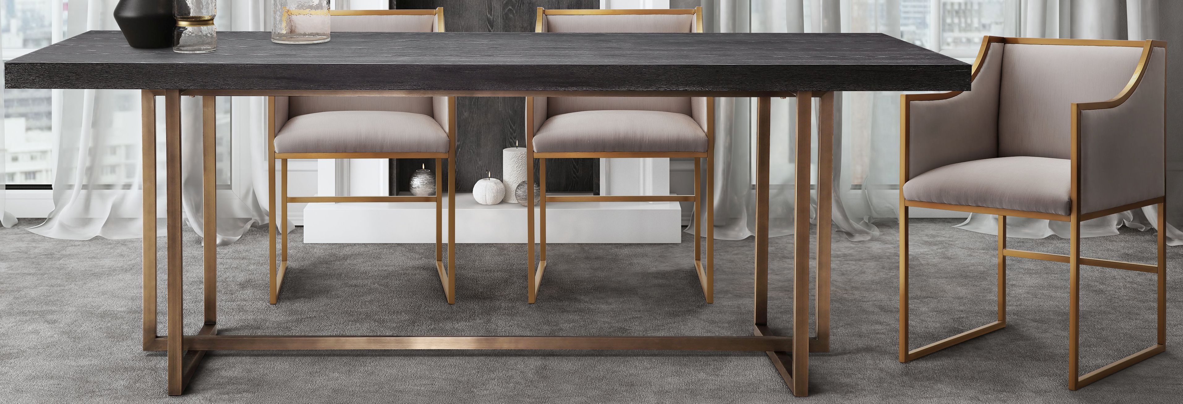 Brushed gold stainless steel base and hardware for the dining table.