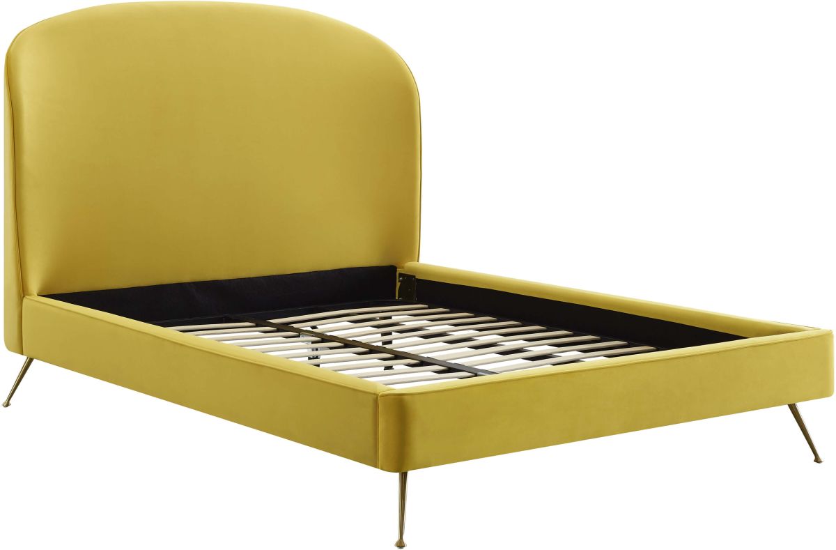 Modern glam is beautifully epitomized in the elegant curves of the Vivi bed. Boasting a dramatic silhouette and gold glamorous legs that pop against the textured velvet upholstery, it demands attention. Available in Twin, Queen and King sizes and multiple color options.