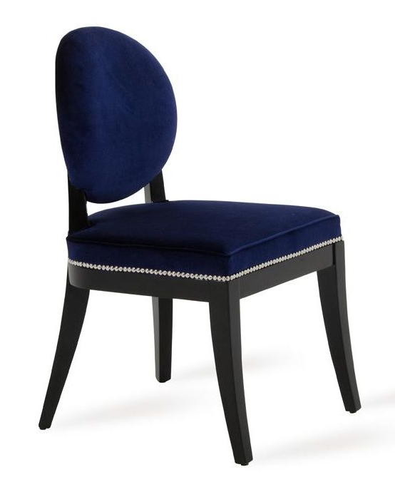 The A&X Isabella Modern Blue Dining Chair exudes class and stylishness featuring an oval back and curved seat upholstered in dainty blue Velour fabric. Framed in black high gloss wood frame, it features silver nail-head trims around the back and seat. Requiring no assembly.Read More