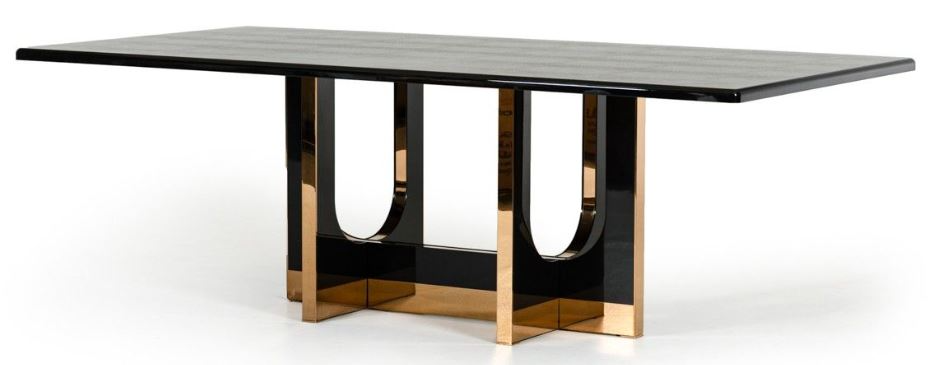 The A&X Padua modern large black crocodile and rose gold dining table features a lustrous rectangular black crocodile textured top that will give grace to any dining room. Laid on a stunning intersecting u-shaped black high gloss and rose gold base, this modern dining table seat 6 comfortably.Read More