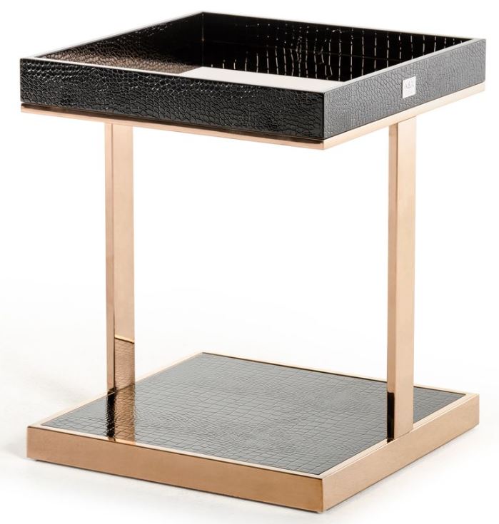 The A&X Padua modern small champagne & rose gold end table boasts of a posh design featuring a mirrored top and a sleek champagne crocodile finish on top. Fine rose gold stainless steel holds it upright with a striking ebony base.Read More