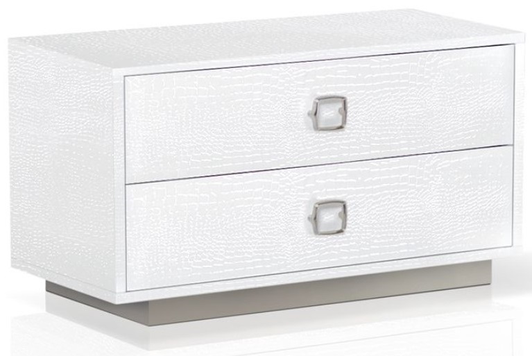 From our famous A&X Collection, the Victoria two drawer nightstand features a unique laser etched crocodile texture in a white lacquer finish. Raised by a sturdy stainless steel base, the Victoria nightstand is made from durable materials and built for continued stability. Matching square stainless steel handles pull the composition together. Pair with the rest of the Victoria bedroom set for a polished look.