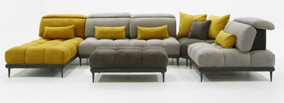 Colors: Yellow fabric, lt grey fabric, medium grey fabric & black leather