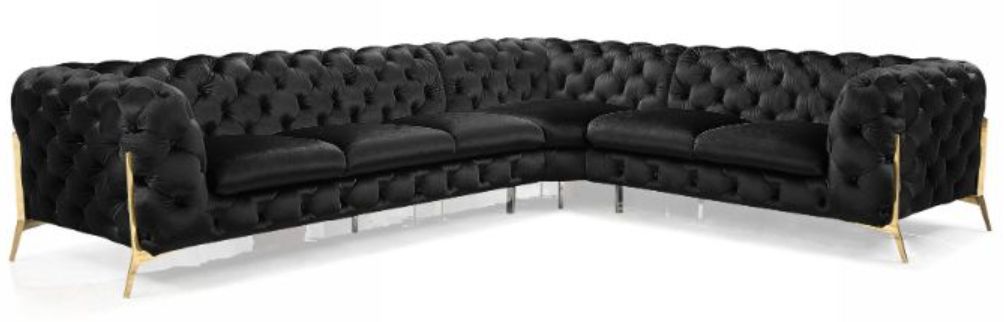 The sheila Black velvet sectional is a beautiful transitional, glam piece that can be used in different design settings; glam, transitional and contemporary. The sectional is upholstered in black velvet fabric, with an overstuffed back and arms in a tuxedo style with diamond button tufting.Read More