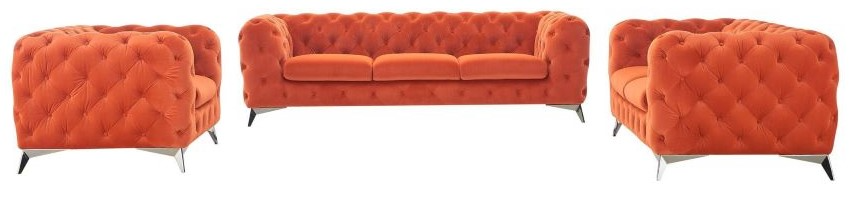 The delilah sofa set is the perfect conversational set for your home. The soft, inviting orange velvet wraps around the plush frame of these lovely items. The diamond tufting and smooth seat cushions juxtapose lovingly. The contemporary style of this traditional sofa set creates harmony in your modern home.Read More