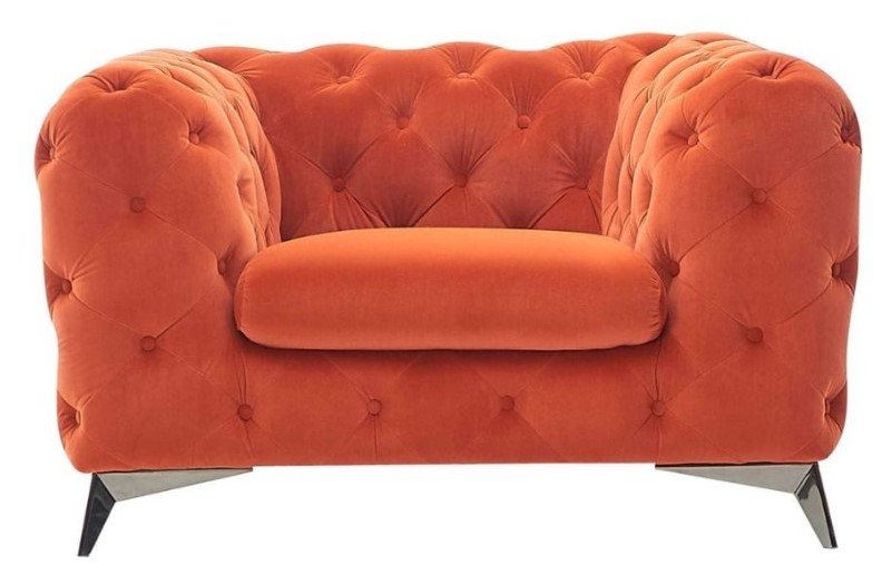 The Delilah lounge chair is the perfect traditional style piece for your contemporary home. Button diamond tufting highlights the rich color of the orange velvet upholstery. Loose seat cushions of a smooth upholstery style that offsets the texture of the rest of the piece. Finished with black metal legs that taper.Read More