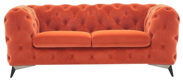 The delilah loveseat is the perfect traditional style piece for your contemporary home. Button diamond tufting highlights the rich color of the orange velvet upholstery. Loose seat cushions of a smooth upholstery style that offsets the texture of the rest of the piece.Read More