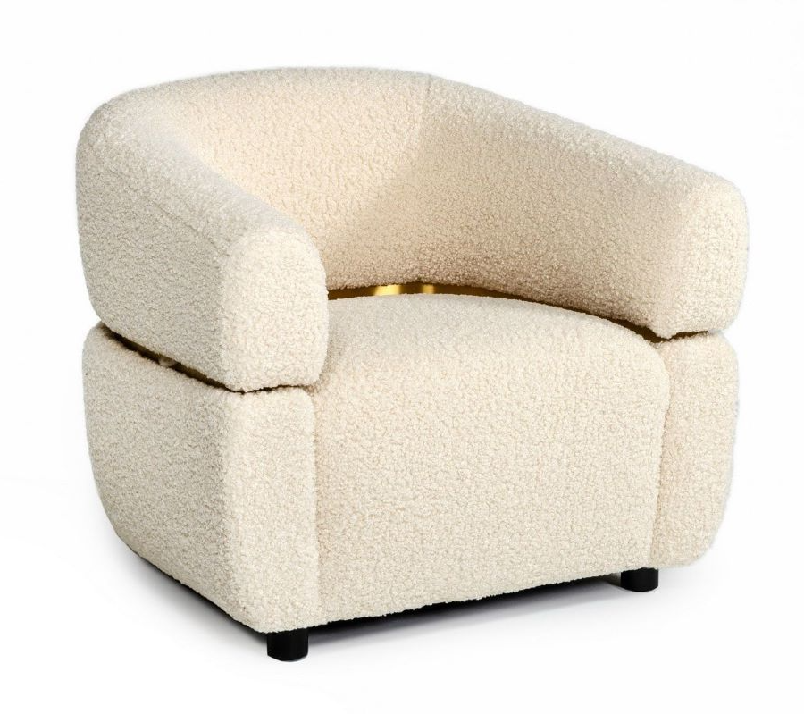 This glam armchair features 100% polyester beige-colored upholstery, black legs, and brushed gold stainless steel accents. The plywood and pine frame is covered by foam-filled cushions, as are the sloped arms.Read More