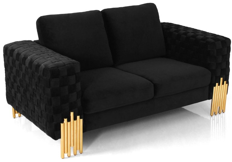 The Georgia Velvet Loveseat is a gorgeous glam masterpiece. The soft black velvet fully upholsters the sturdy wood frame to create a solid foundation for this stylish piece. The Legs are made of stacked tubular gold that creates an art deco abstract pattern.Read More