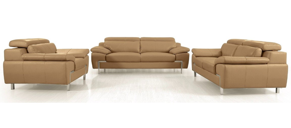 The three-piece grange collection consists of a three-seater sofa, a loveseat and a single chair, which can comfortably seat up to six. The modern design, adjustable headrests and the camel genuine leather upholstery will bring luxury and comfort into your home.Read More