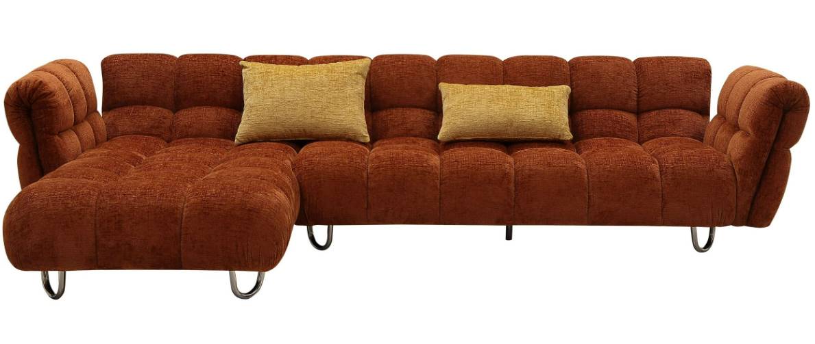 The Jacinda sports a burnt orange fabric with yellow throw pillows and stainless steel legs to complete the look that is a modern twist on a throwback design. The sectional sofa can also be made with a Right Arm Facing Chaise.