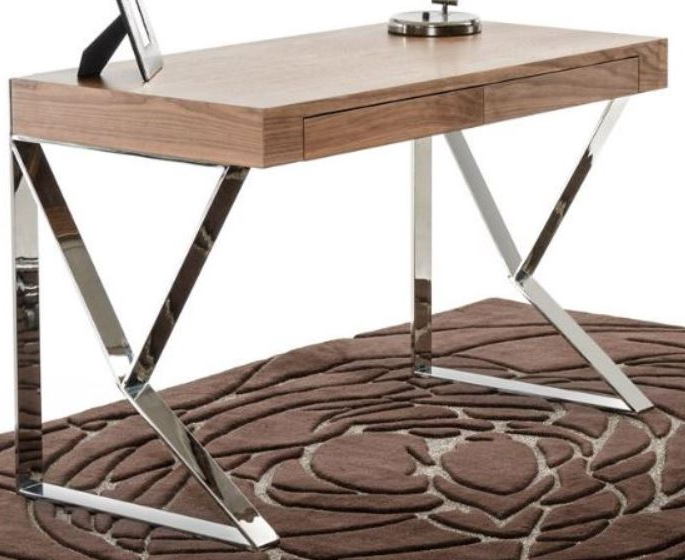 Contemporary arrow shaped legs made with polished stainless steel brace the slim walnut veneered desk top. The desk top contains two drawers to stash office supplies. Complete your office space and match it with the maze bookcase. Also available in a white lacquer finish.Read More