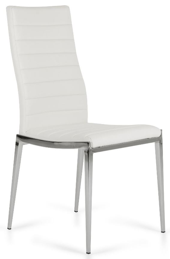 The Modrest Libby modern white leatherette dining chair has a dainty look featuring ridges on the white leatherette upholstery. Sturdy chrome legs provide sturdy support to this modern dining chair that measures W18" X D23" X H38".Read More