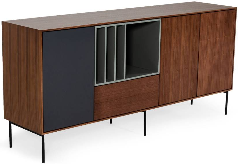 This oversized modern buffet provides ample storage and style. This buffet features three cabinets of storage with one shelf within each cabinet, two pull-out drawers, and four vertical cubby holes. The mix of walnut veneer, open storage, and black metal legs is something that will help elevate the style of any space.Read More