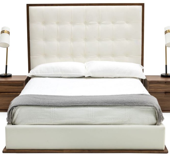 The amberlie bed is a stylish modern piece that will fit perfectly in many settings. The simple lines of this piece are accented by the walnut veneer finish of the frame. White vegan leather upholstery finishes the oversized headboard and rails creating a strong silhouette.Read More