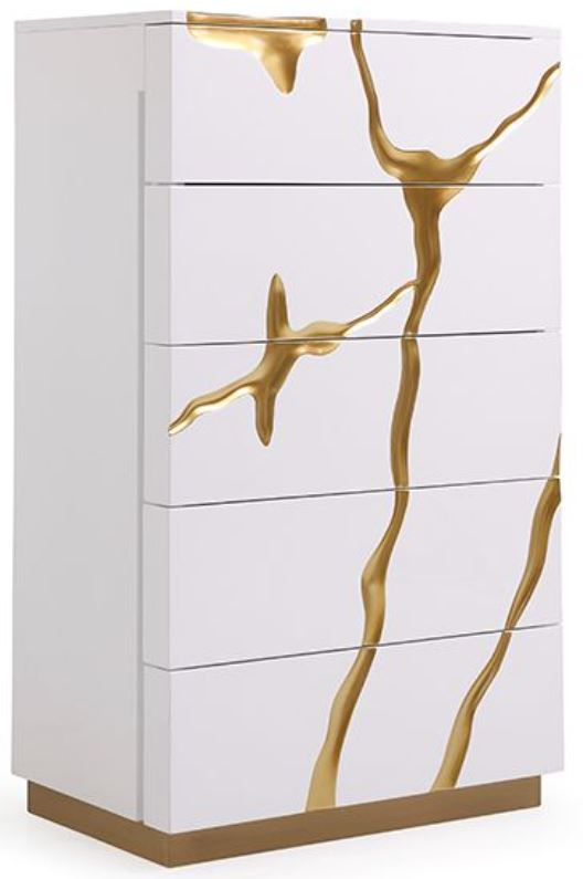 Breathing visual freshness into your room is the Modrest Aspen modern white and gold chest. Fitted with five soft-closing drawers, it features a lustrous white high gloss finish punctuated with artistic gold-painted accents. The drawers have pulls hidden on their sides to preserve its symmetry.Read More