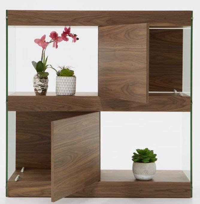 Presenting a streamlined stylish design, the Modrest Aura modern walnut and glass square cabinet features 2 open shelves and 2 shelves with doors. Finished in walnut veneer, it has clear tempered glass side. All shelves are of equal sizes, giving you ample space to store items in an orderly manner.Read More