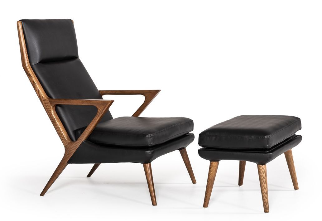The Modrest Fulton Modern Black Lounge Chair & Ottoman. The lounge chair has an extraordinary silhouette with an angled tall back with headrest and seat with dense cushions upholstered in smooth black leatherette. It features trilateral supports on the flared arms, giving you better positioning and for a fresher feel.Read More
