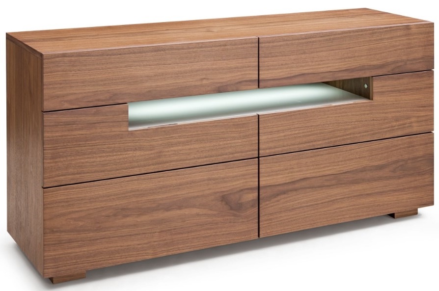 An LED light in the top middle cubby provides not only accent lighting but functional lighting for early morning or nighttime use. Six drawers with silent drawer gliding and soft closing mechanisms administer abundant storage for your clothing. Finished in a walnut wood veneer finish for a warm and contemporary design.Read More