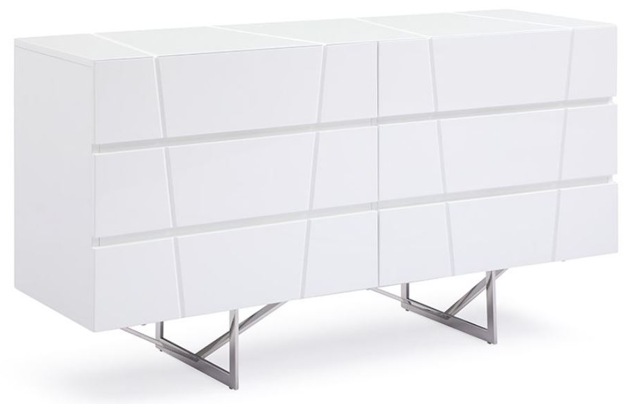 The Chrysler dresser supports your modern needs in every way. Adding luster to its boxy structure is the suave high gloss finish punctuated with diagonal cutouts. Fitted with six drawers that glide easily and close quietly, this dresser keeps essential items nearby. Stainless steel hairpin legs finish this lovely piece.Read More