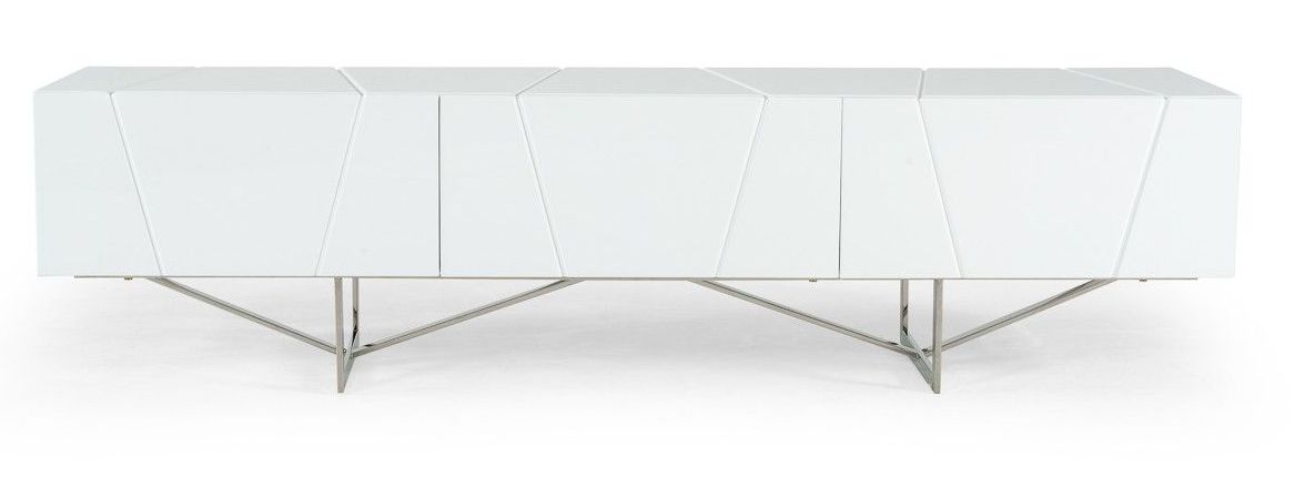 Bring a striking addition in your living space is this rectangular Modrest Chrysler Modern White TV Stand. Glistening in a white high gloss finish, it comes with 3 awe-inspiring drawers with oblique notches on top and drawer fronts. Square and triangular shaped legs provide support.Read More