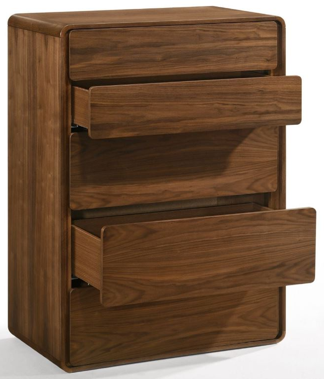The rounded edges of the Dustin chest give this piece a soft and subtle aesthetic. This solid walnut rubberwood chest has 5 drawers that use a slide push to open the drawers giving it a unique and practical elegance.Read More