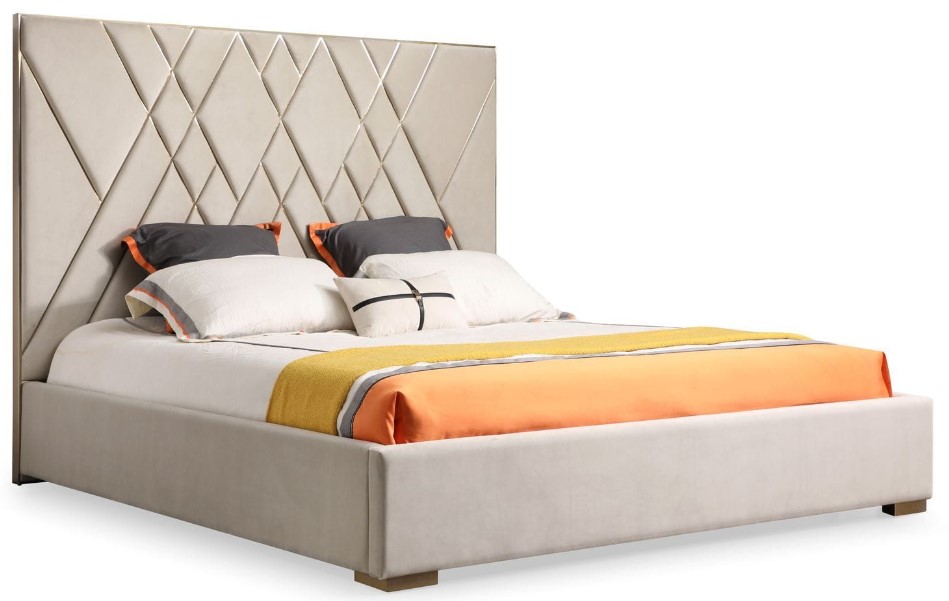 The Eldora Bed is a stylish modern bed with glam materials that brightens up any space. A beautiful beige velvet fully upholsters the frame of this tall bed. Brushed brass inserts create a geometric pattern that adds visual interest. Brushed brass is also accented on the low profile legs. Perfect for a contemporary bedroom.Read More