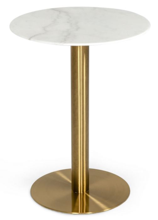 The Fairway bar table boast a 100% white marble top. This glam table has a brushed gold stainless steel pedestal base. The gloss finish protects the marble from scratches and stains while adding a touch of elegance. The mid-century silhouette will match your retro style living room perfectly.Read More