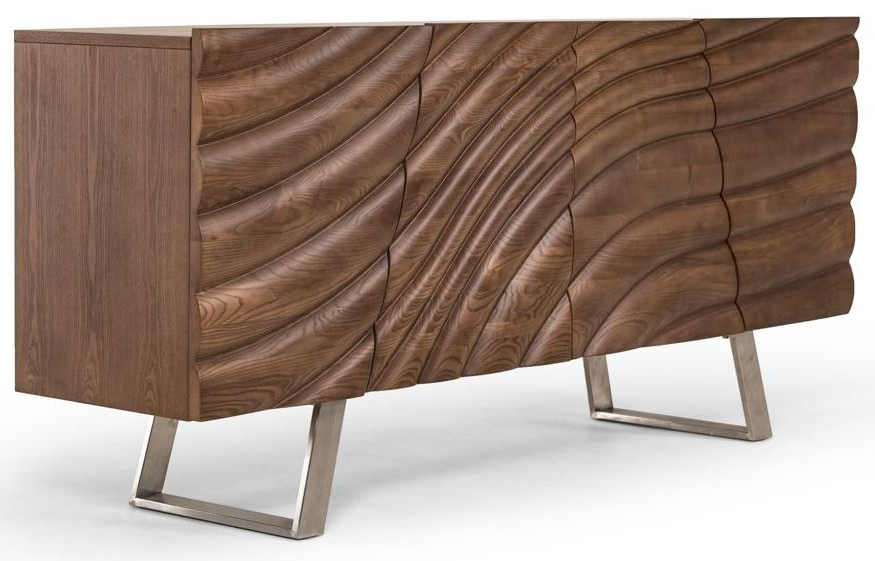 The Finley buffet features a smooth walnut veneered body that is perfect for a mid-century style home. With walnut finished ash wood doors featuring a corrugated design, this piece flows and balances with astounding ease. Standing on brushed stainless-steel legs, it features 4 doors with interior roomy shelves.Read More