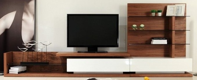 The Modrest Jefferson modern walnut and white high gloss tv unit offers a sleek design in walnut veneer and white high gloss finish. Functionality is provided by the 3 grey glass open shelves, 2 drawers with soft-close mechanism and an extended end with 2 shelves on the left facing side.Read More