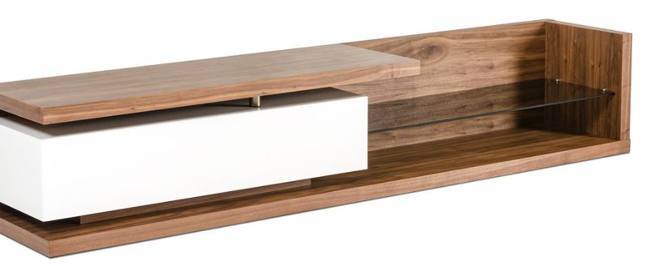 The Modrest Jefferson low modern walnut and white tv unit features a well-constructed design in walnut veneer and white high gloss finish. It features 2 open shelves separated by a clear tempered glass and a single drawer with 2 compartments sufficient enough to store media gadgets.Read More