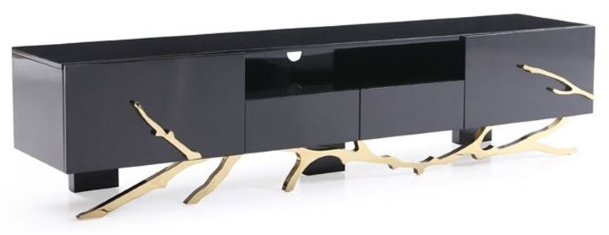 The modrest legend tv stand comes in a dramatic and bold shade of black in a high gloss finish. The rich black finish juxtaposes perfectly with the delicious gold branch style accents. It includes two drawers, two doors, and one electrical wire hole.Read More
