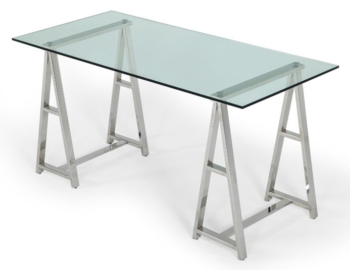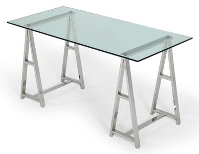 The Ostrow Desk is a beautiful modern desk, perfect for any contemporary home. The sawhorse base is made of polished stainless steel that shines in the light. The hard steel against the delicate look of the glass top makes a beautiful juxtaposition. Three drawers offer storage options and a visual draw to the eye.Read More