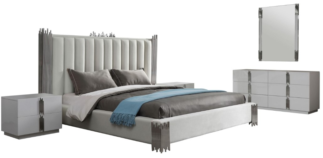Merging royal elegance with a modern touch, the Modrest Token Modern White and Stainless Steel Bedroom Set has a spacious bed with a sunken bed frame. The tall headboard has vertical ridges in stainless steel, making you feel like royalty.Read More