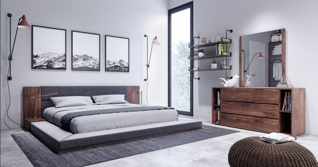 The bed is Japanese-inspired and features an upholstered mid-section on the headboard for extreme comfort. The bed's full platform frame has a sunken central section exclusive for the mattress where slats are placed allowing the mattress to breathe. Both sides of the bed have built-in nightstands that form part of the bed frame to hold table lamps and other utilities. Part of this ensemble is a 6-drawer dresser with built-in open bookshelves, two on each side, keeping your bedroom spic and span. A Walnut Veneer finish frame rectangular mirror comes with this set. This modern bedroom set gives an instant lift to any modern home. The wood frame ensures years of durability.