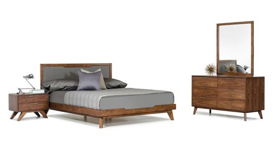 The Nova Domus Soria Modern Grey & Walnut Bedroom Set combines charm and finesse featuring a Walnut veneer finish with wood grains, giving it a touch of mysteriousness. With a near to the ground design, it features a grey fabric headboard and slats for mattress breathability.Read More