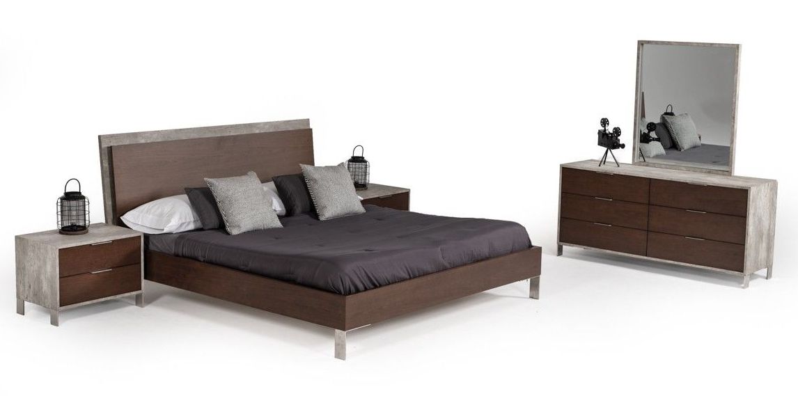 The Nova Domus Conner Modern Dark Walnut & Concrete Bedroom Set features a low-to-the- ground bed design with 1.5-inch dark Walnut oil coated veneer bed sides and recessed slatted mattress frame. Fitted with a medium-height headboard, it features a 1-inch grey concrete headboard back and a 1-inch dark Walnut.Read More