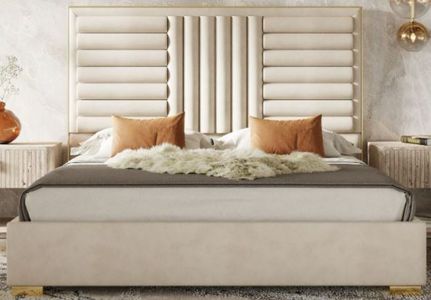 The Modrest Daystar/Roma bedroom set offers style, elegance, and comfort to your home. It includes a choice of queen, eastern king, or California king bed, two nightstands, dresser, and mirror. The daystar bed is beige velvet, while case goods feature travertine stone laminate with champagne gold accentsRead More