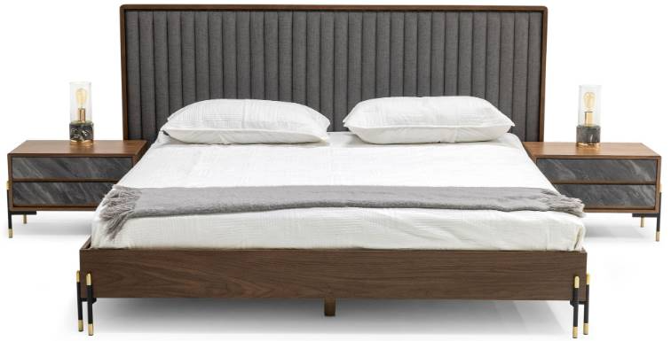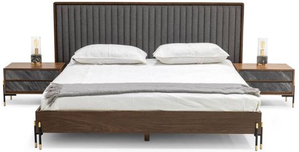The modern and rustic styles of the Metcalf Bed are perfect for your contemporary home. A channel tufted grey fabric headboard is surrounded and supported by walnut veneer finishes. Black and gold hairpin legs finish the rustic style of this mid-century bed.Read More