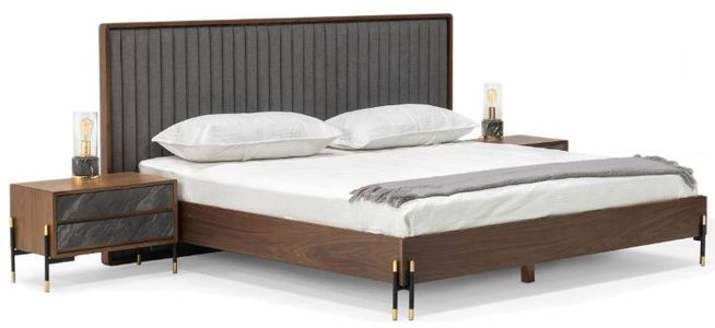 The modern and rustic styles of the Metcalf bed are perfect for your contemporary home. A channel tufted grey fabric headboard is surrounded and supported by walnut veneer finishes. Black and gold hairpin legs finish the rustic style of this mid-century bed.Read More