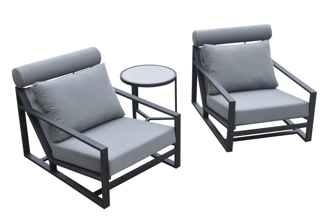 Enjoy the sun and get some fresh air while relaxing on the Renava Boardwalk Outdoor Grey Lounge Chair Set. It consists of 2 chairs and a side table in finely contoured black powder coated aluminum frame. Fulfilling its comfy feel are 5-inch thick seat cushions .Read More