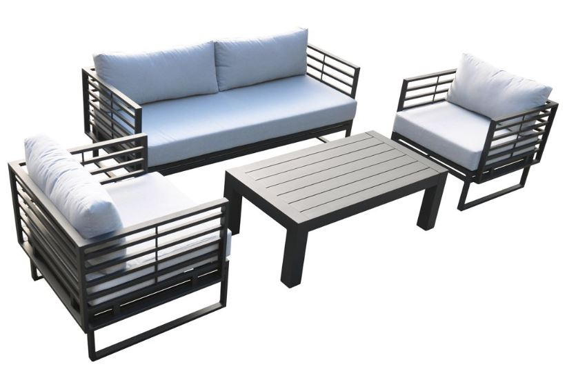 The backs and arms are designed with the same height that provides a secure comfy seating position. Completing this set is a rectangular top coffee table with a round centerpiece to keep bottles of wine from falling. The boxy styles of this modern outdoor sofa set will make your garden or patio always ready for socialization.